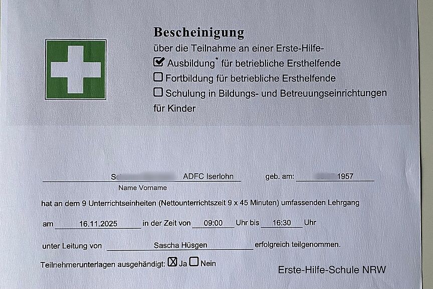 ADFC MK: Erste-Hilfe Kenntnisse aufgefrischt.