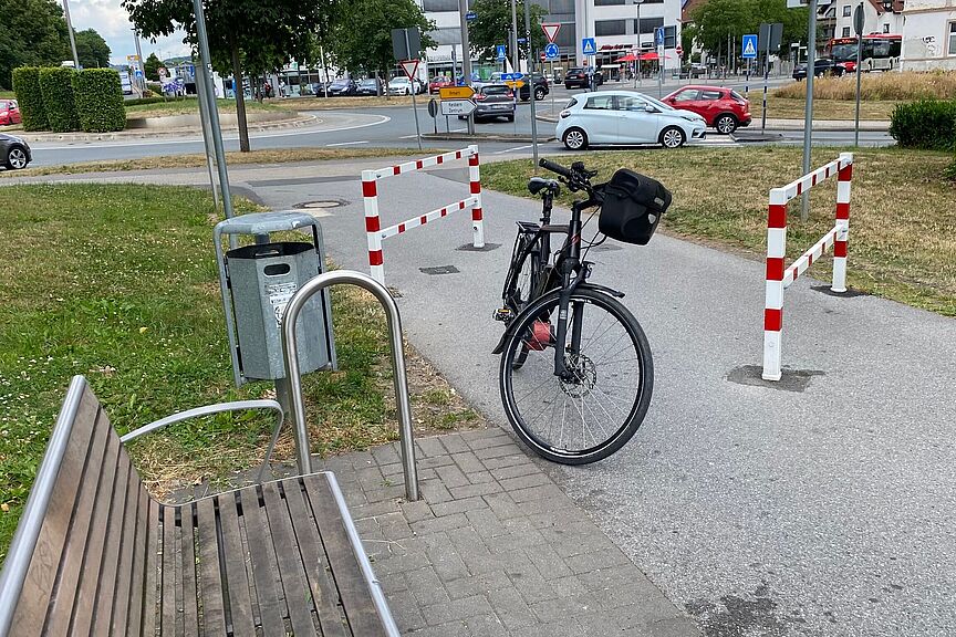 Wechsel der Baufelder für die Bevorrechtigung des Radverkehrs auf der ehemaligen Bahntrasse.